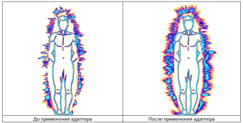 На рисунке 3 показана типичная кирлианограмма человека до и после системного адаптера. Видно, что характер излучения неоднороден. Наиболее яркое излучение окрашено в голубой цвет, средней яркости – в синий, слабое излучение в красный и желтый. Если цвет свечения – голубой, то и канал передачи информации работает хорошо. Это свечение вокруг тела характеризует качество нашего взаимодействия с окружающей средой. Нехватка яркости свидетельствует об искажении информационного канала. Видно, что системный адаптер существенно улучшает качество ауры (площадь свечения выросла в два раза).