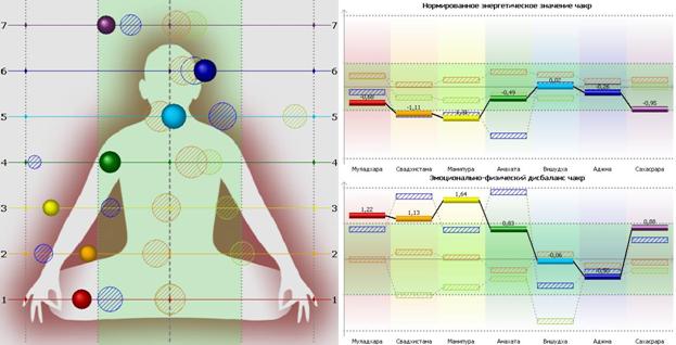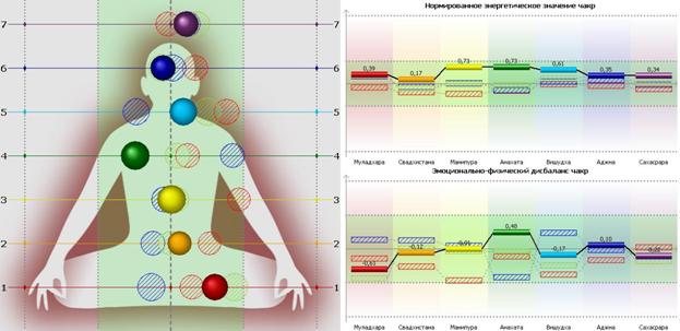 На одном из наших семинаров мы провели работу по соединению группы из четырех человек, работающих вместе и имеющих у себя системные адаптеры Светлица-Супер. Для контроля процесса использовали ГРВ метод. На рисунке 4 представлены диаграммы распределения энергии по энергетическим центрам этих людей до начала работы.